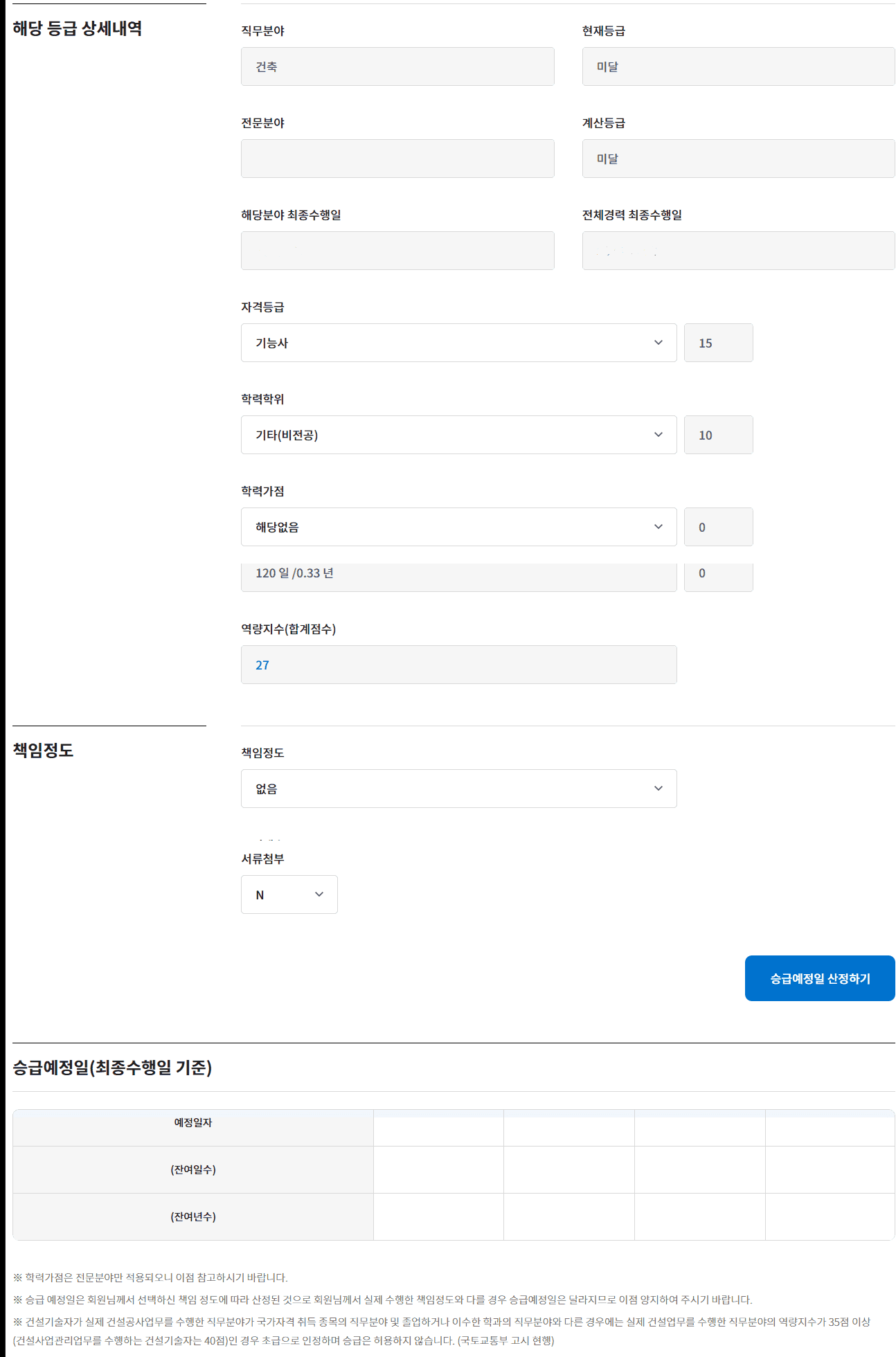 3. 아래로 내려가며 확인하다가 '책임정도'에서 현장 등록할 때와 같게 참여기술인이나 현장관리인등을 골라 선택해 줍니다. 그리고 '승급예정일 산정하기' 버튼을 눌러줍니다.