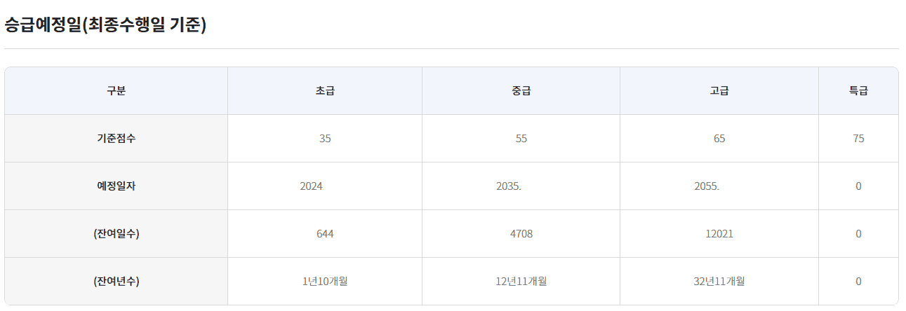 그렇다면 언제 승급이 되는지 궁금해지는데, 다음처럼 승급예정일을 미리 알아볼 수 있습니다.