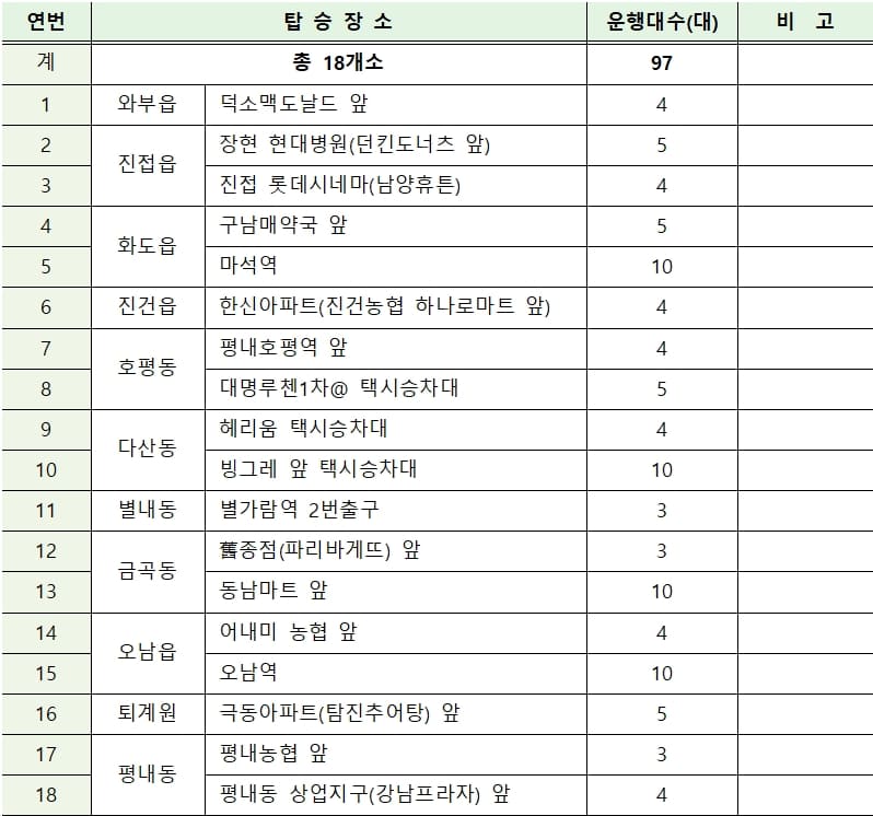- 특징 : 지정 장소에서 대기 중인 무료수송 깃발 또는 스티커 장착 택시에 탑승